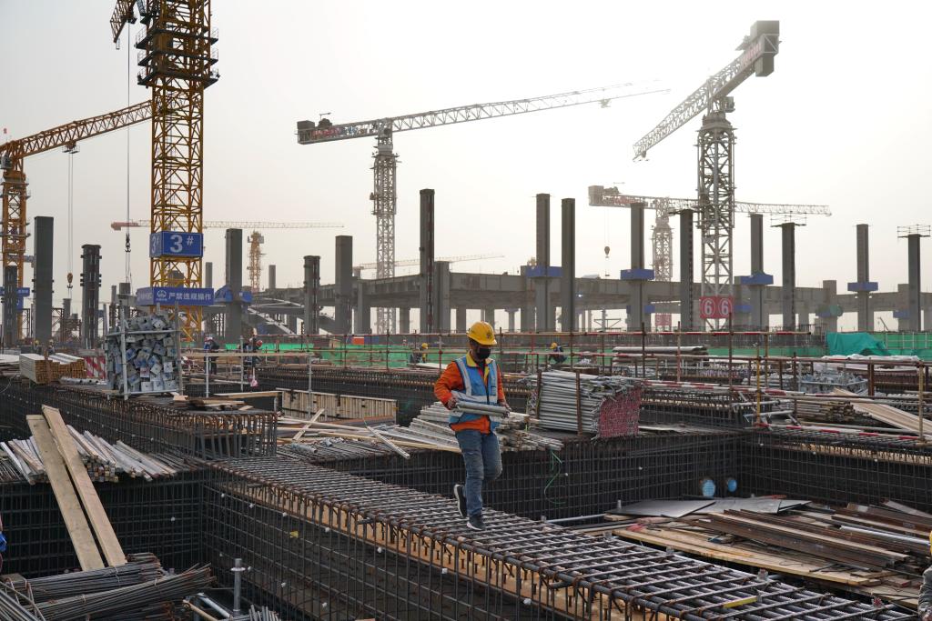 工人在京雄城际铁路雄安站建设现场施工(2020年3月18日摄)。