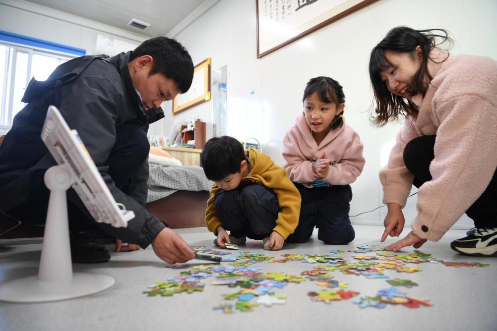 李辉和家人在项目部宿舍内玩拼图游戏(2023年1月18日摄)。