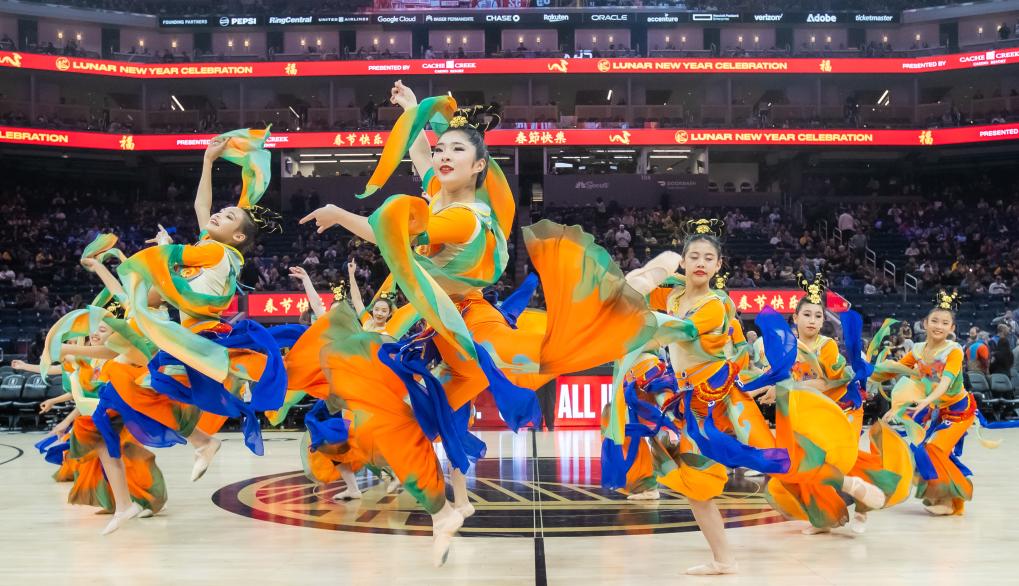 2月14日,旧金山华人艺术团演员在比赛中场为观众表演,欢庆中国农历新年。新华社发(董旭东摄)