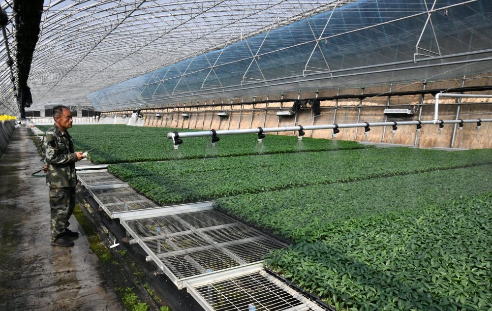 山东省淄博市临淄区皇城镇的一家育苗基地,工作人员操作喷灌设备为幼苗浇水(2024年3月15日摄)。新华社记者 徐速绘 摄