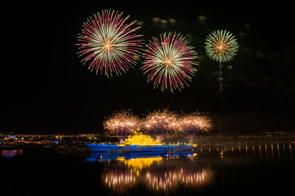 5月2日晚,在天津滨海新区泰达航母主题公园,上演“夜上津门 焰绘航母”“五一”特别版航母焰火秀。新华社发(杜鹏辉摄)