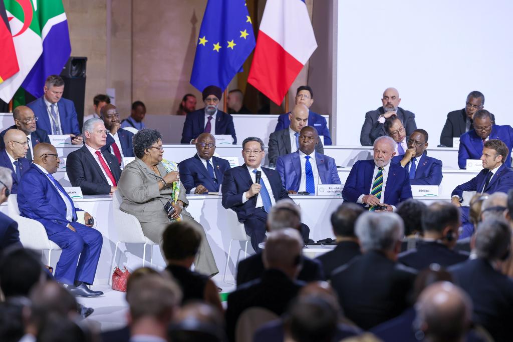 2023年6月23日上午,国务院总理李强在巴黎出席新全球融资契约峰会闭幕式并发表讲话。新华社记者刘彬 摄