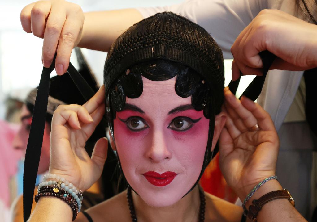 2023年9月9日,在法国巴黎中国文化中心,法国观众体验昆曲旦角扮相。新华社记者高静 摄