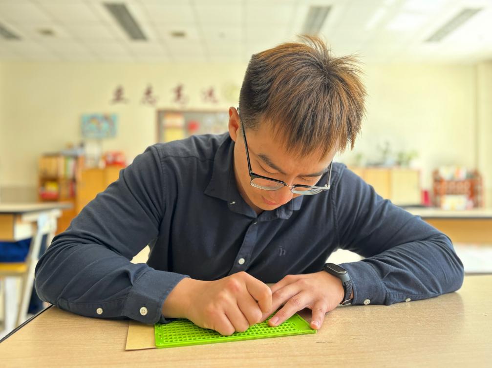 学习和行动,是克服挑战和焦虑的“良药”。从简单的写盲文评语着手,他慢慢学会了中英盲文的读写方式。在前辈的指导下,他也摸索出教学的方式方法。采访现场,他还为记者展示了手刻盲文的技巧。“刻盲文要从右往左,盲文是镜像状态……”