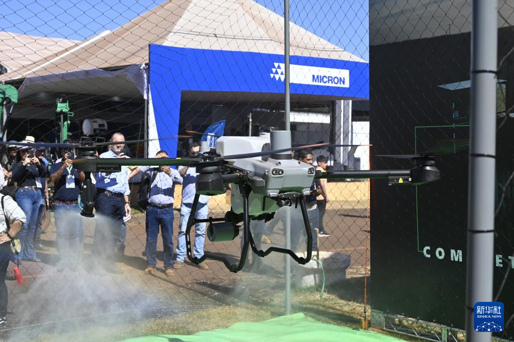 5月2日,在巴西里贝朗普雷图举行的2024年巴西农业科技展上,参展商演示一款极目农业无人机。新华社记者 周永穗 摄