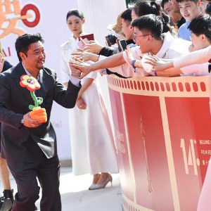 4月18日,电影《末路狂花钱》演员贾冰(左三)等与观众在第十四届北京国际电影节开幕红毯上互动。新华社记者 陈钟昊 摄