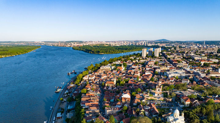 塞尔维亚贝尔格莱德泽蒙小镇景色(2024年4月29日摄,无人机照片)。新华社发(王韡摄)