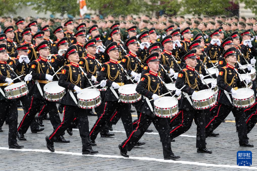 5月9日,在俄罗斯首都莫斯科,鼓手编队走过红场。新华社记者 白雪骐 摄