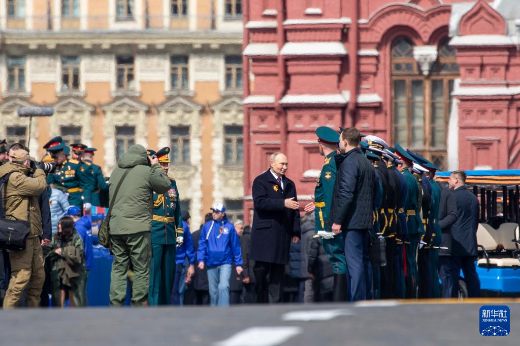 5月9日,在俄罗斯首都莫斯科,俄罗斯总统普京(中)与参与阅兵式的人员握手。新华社记者 曹阳 摄