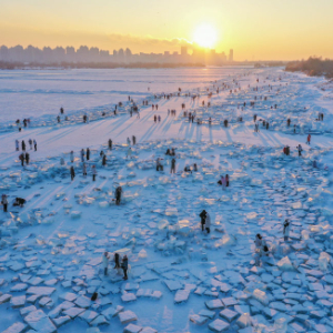 2024年1月7日,在封冻的松花江哈尔滨段,游客在日落时分的“钻石海”游玩(无人机照片)。新华社记者 谢剑飞 摄