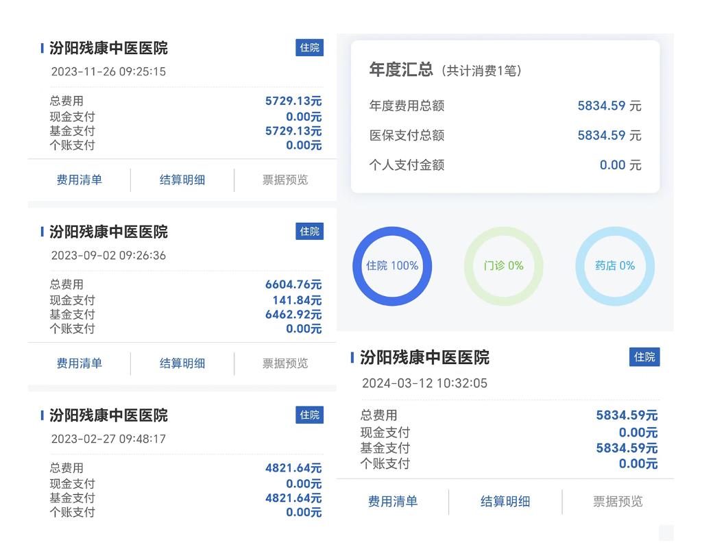 上图是在国家医保报销平台上查询到的某位五保老人在残康中医医院的医保报销记录,2023年住院3次,2024年春季住院1次。(拼板照片)新华社发(杨哲摄)