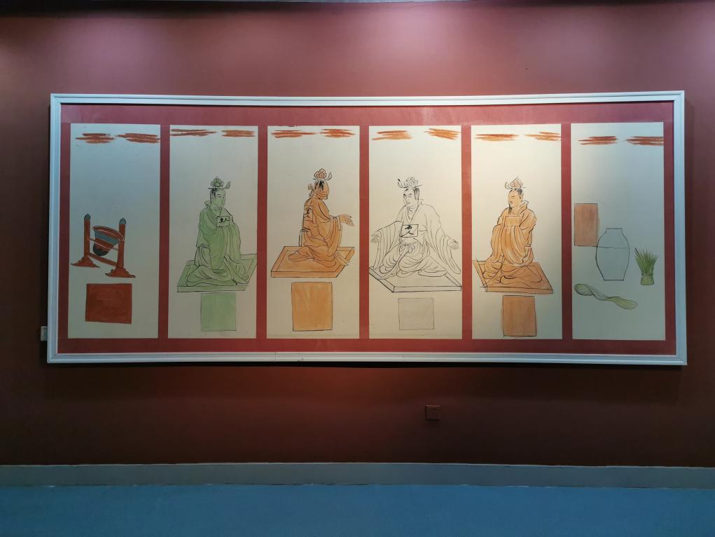壁画左起第一个是“欹器”,即古代盛水盛酒的器皿,“虚则欹、中则正、满则覆”,告诫人们物极必反。接下来4幅人物画像分别是“玉人”“金人”“石人”“老者”,表达儒家入世的人生境界和一个人从少年到老年的处世哲学。