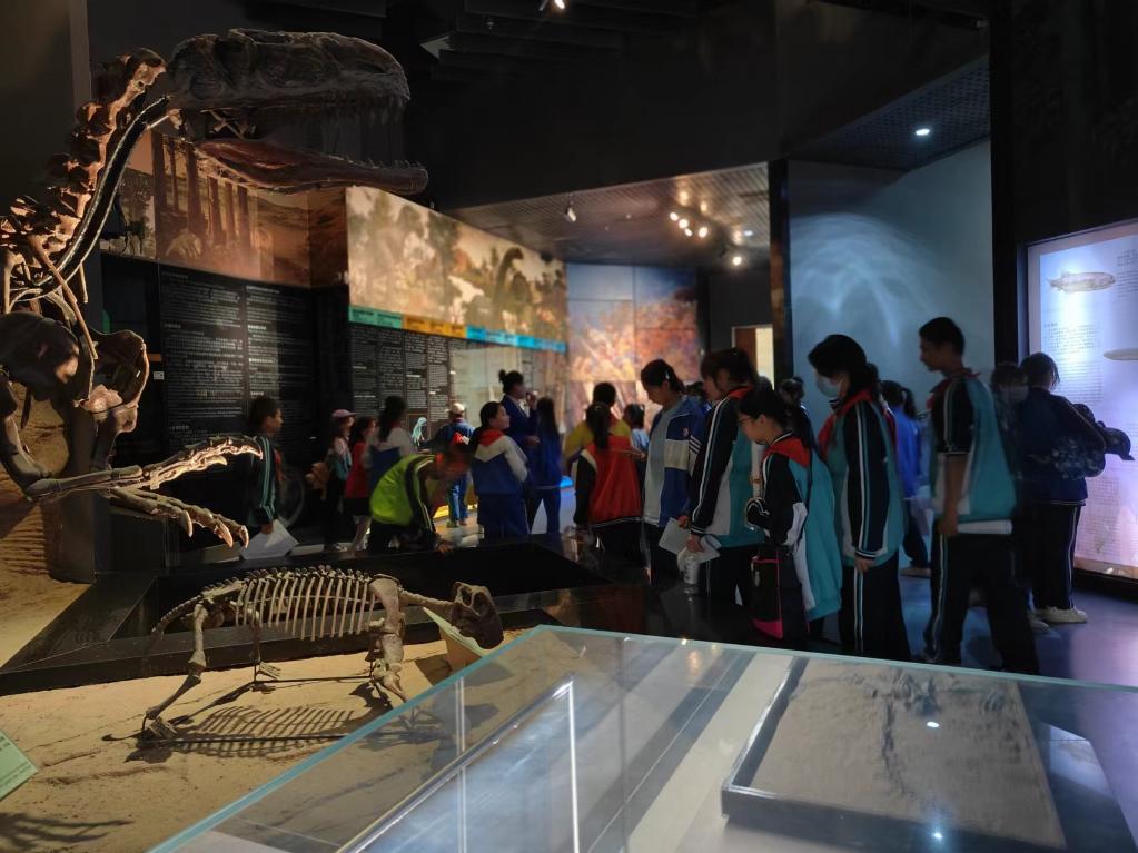 游客在参观吐鲁番美丽巨犀化石。新华社记者 张瑜 摄