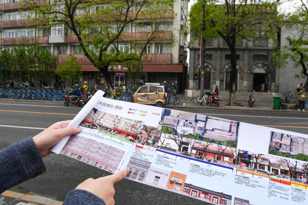 孙书同介绍崇雍大街改造中设置的历史文化街区探访地图(4月23日摄)。