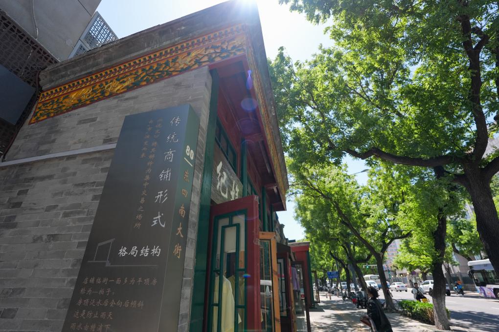 在东四南大街拍摄的介绍东四南大街传统商铺形式的装饰(5月11日摄)。