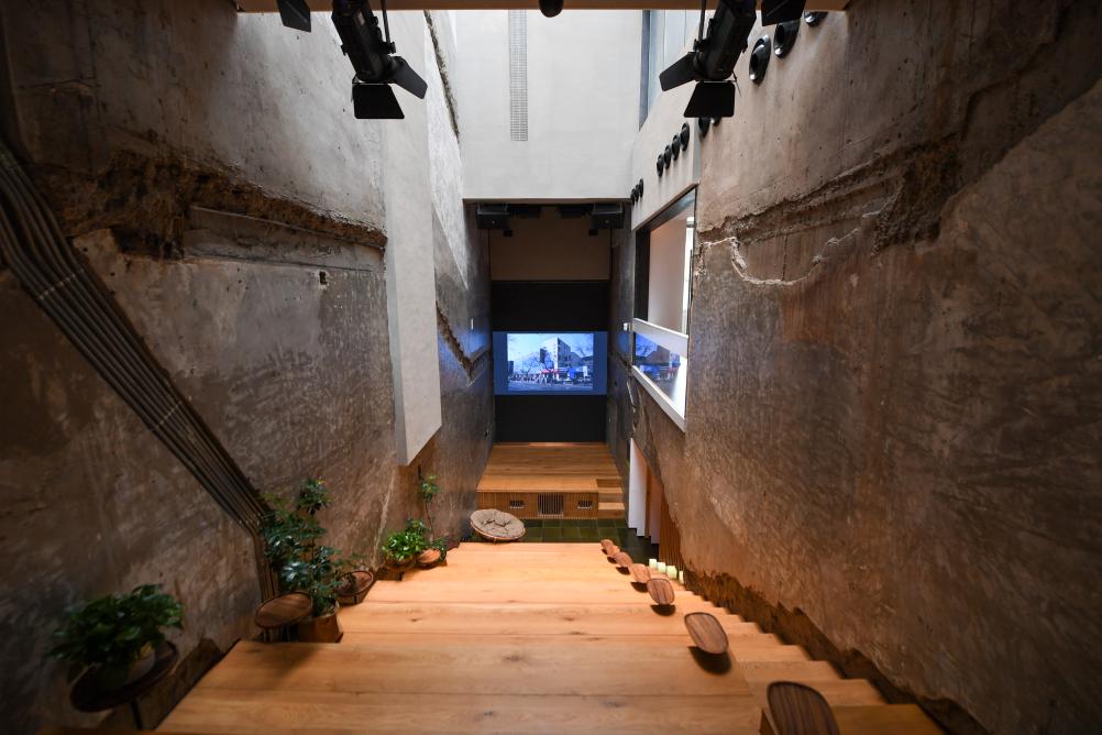 位于东四南大街,由原三友商场楼梯间改造而来的雪莲·亮点文创园中的偶得剧场(4月23日摄)。小剧场保留斑驳裸露的原始墙面,又安装吸声板、音响、灯光、阶梯座椅和舞台,形成一个3.3米宽、16米挑高、能容纳40多名观众的特色剧场。