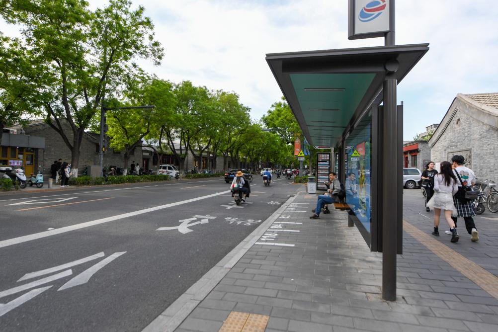 在东四北大街东四十二条公交车站,乘客在新设置的“港湾式”公交站等候公交车(5月11日摄)。推动“慢行优先”“健步悦骑”