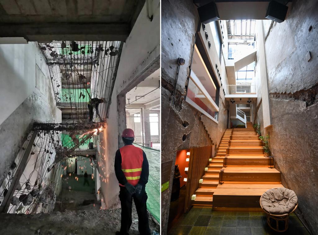 左图为改造中的位于东四南大街的原三友商场楼梯间(资料照片);右图为2024年4月23日拍摄的由原三友商场楼梯间改造而来的雪莲·亮点文创园偶得剧场。不少商场店铺转型