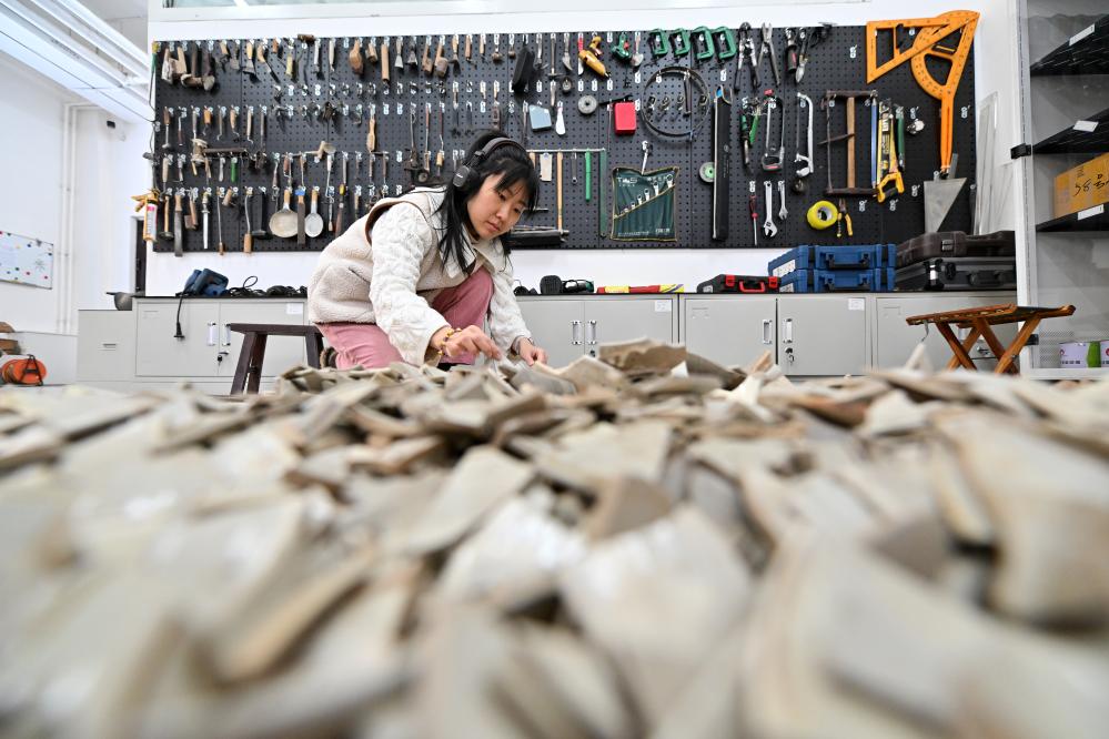 在云冈研究院可移动文物修复室,工作人员高嘉珩在进行瓷器修复(2024年2月26日摄)。