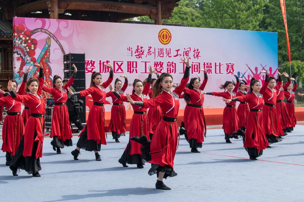 5月13日,婺城区职工在金华市古子城广场参加“婺韵工间操”比赛。新华社发(胡肖飞 摄)