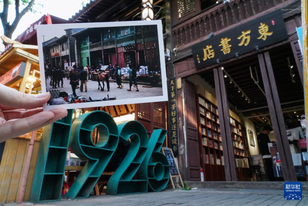 这是4月25日拍摄的文明街上的东方书店,明信片展现的是1944年东方书店的样貌。