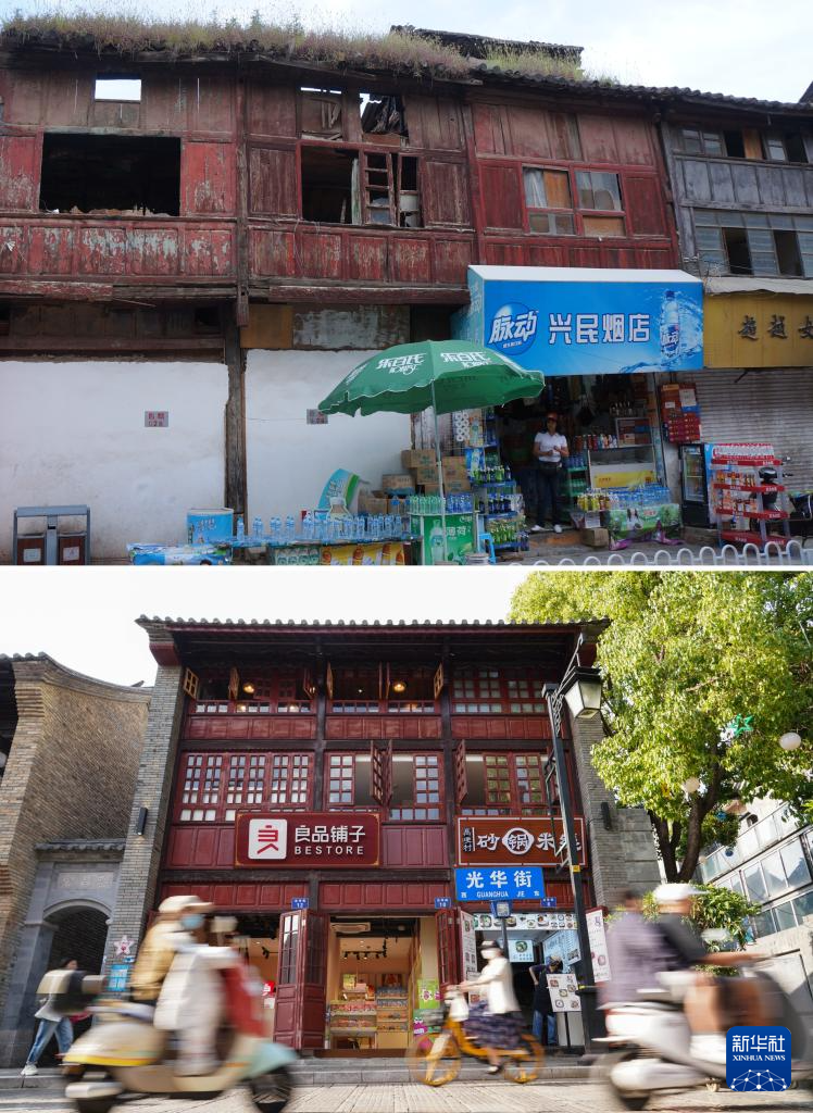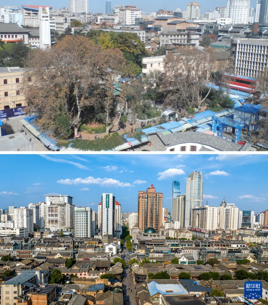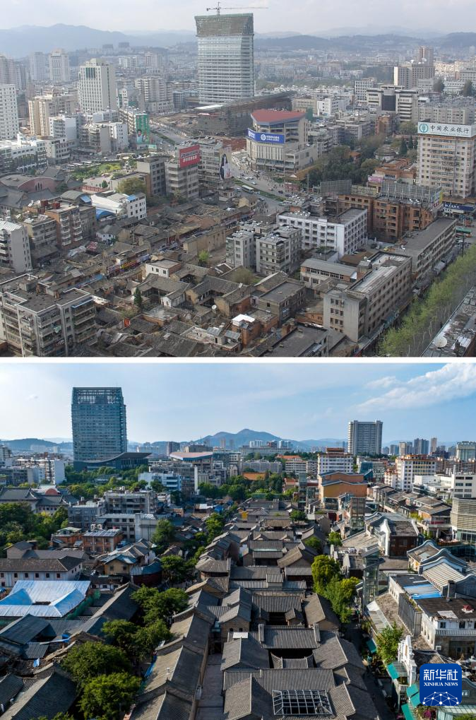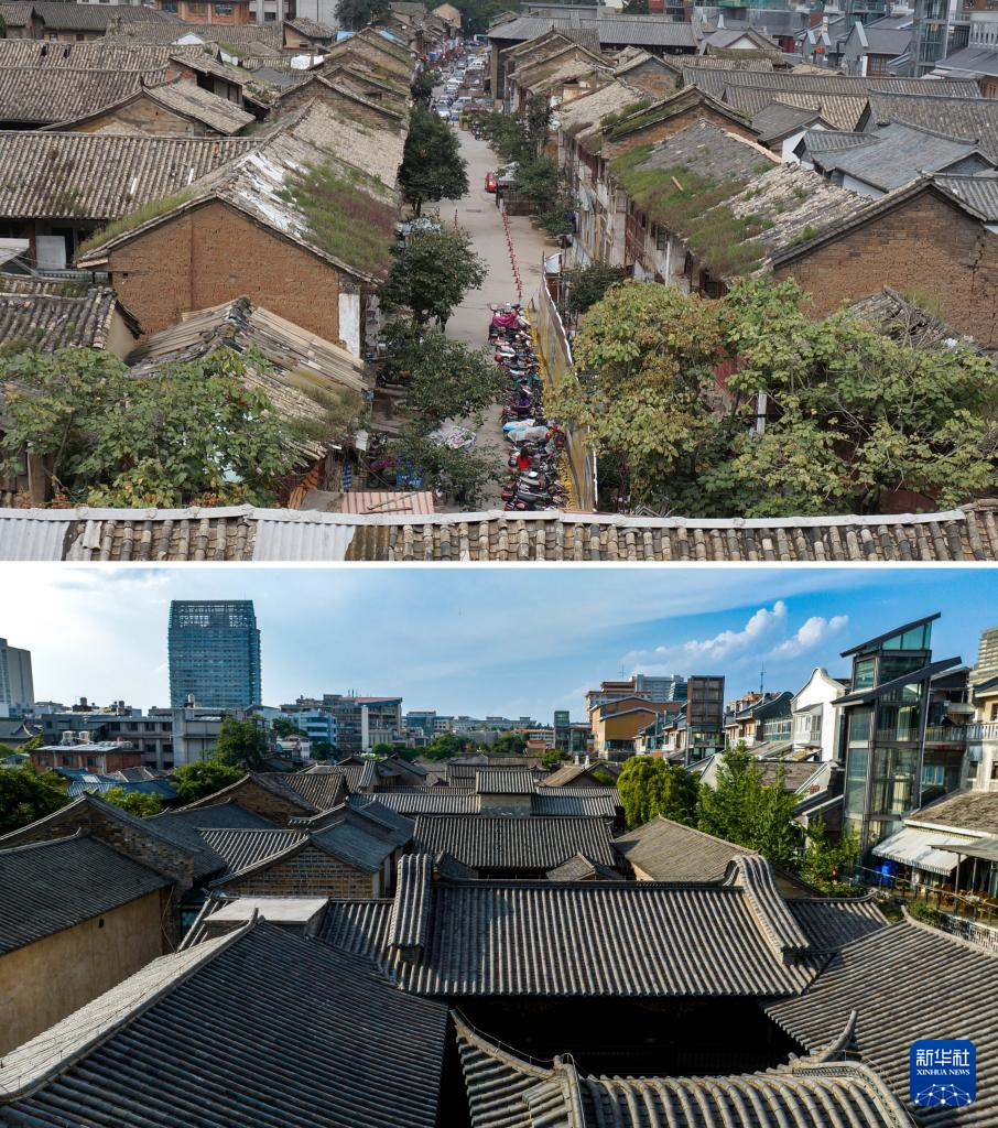 拼版照片:上图是修缮前的昆明老街(资料照片,新华社发陈忆秋摄);下图是5月13日拍摄的昆明老街(无人机照片,新华社记者胡超摄)。