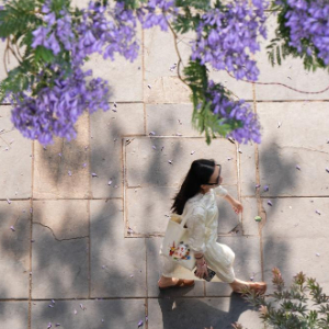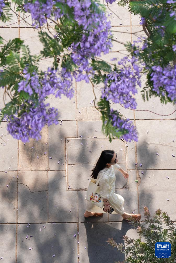 行人在钱王街上盛开的蓝花楹下走过(4月24日摄)。