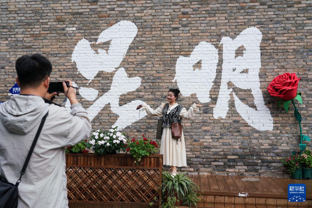一名女士在钱王街上拍照留念(4月25日摄)。