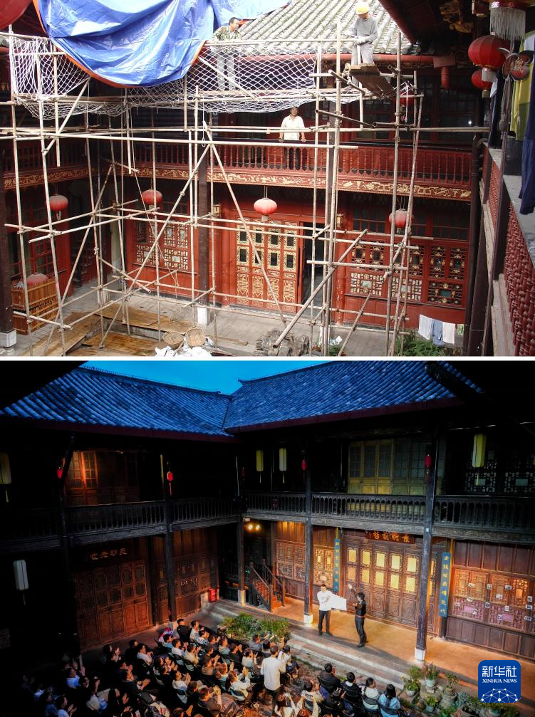 拼版照片:上图是修缮前的马家大院(资料照片);下图是5月8日,人们在钱王街上的马家大院里观看“庭院剧”(新华社记者王静颐摄)。