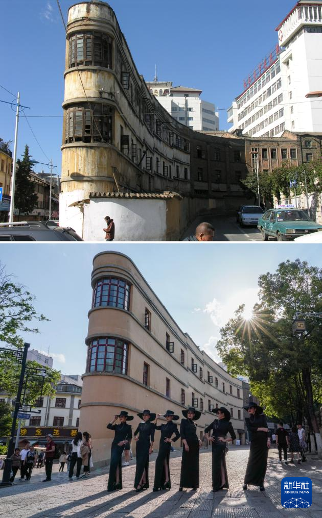 拼版照片:上图是修缮前的“酒杯楼”(资料照片,新华社发陈忆秋摄);下图是4月25日,模特在“酒杯楼”前摆造型拍摄视频(新华社记者王静颐摄)。