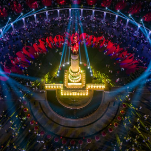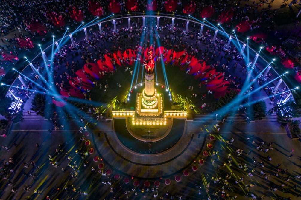 哈尔滨防洪胜利纪念塔广场的灯光秀。新华社记者 张涛 摄