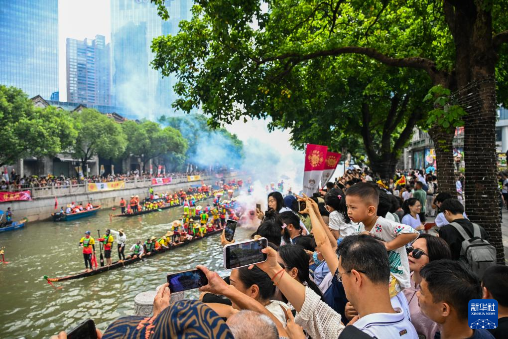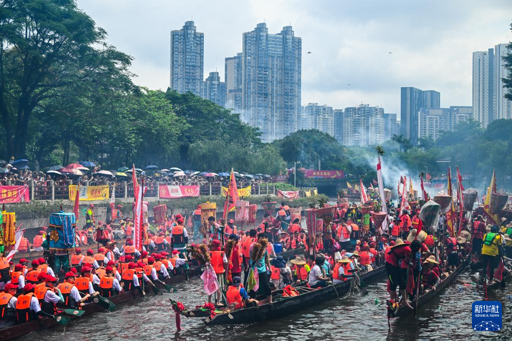 6月10日,国内外游客汇聚在猎德观赏“龙船景”。“龙船景”是广府地区水乡在端午期间举办的一种民俗活动。
