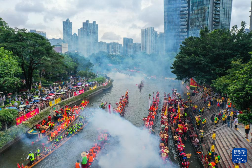 6月10日,猎德村热闹的传统龙舟“龙船景”与繁忙的现代都市交汇相融(无人机照片)。“龙船景”是广府地区水乡在端午期间举办的一种民俗活动。