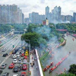 猎德村是位于广州珠江新城CBD中心的一座历史悠久的古村。每年端午期间,猎德村民都会遵照岭南龙舟文化习俗,在祠堂和河涌,用各种充满仪式感的“龙船景”展示对端午文化的传承。