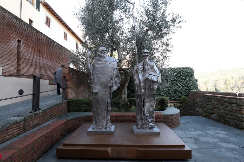 中国美术馆馆长吴为山创作的雕塑作品《超越时空的对话——达·芬奇与齐白石》在意大利芬奇市莱昂纳多·达·芬奇博物馆和图书馆“落户”。(由中国美术馆供图)