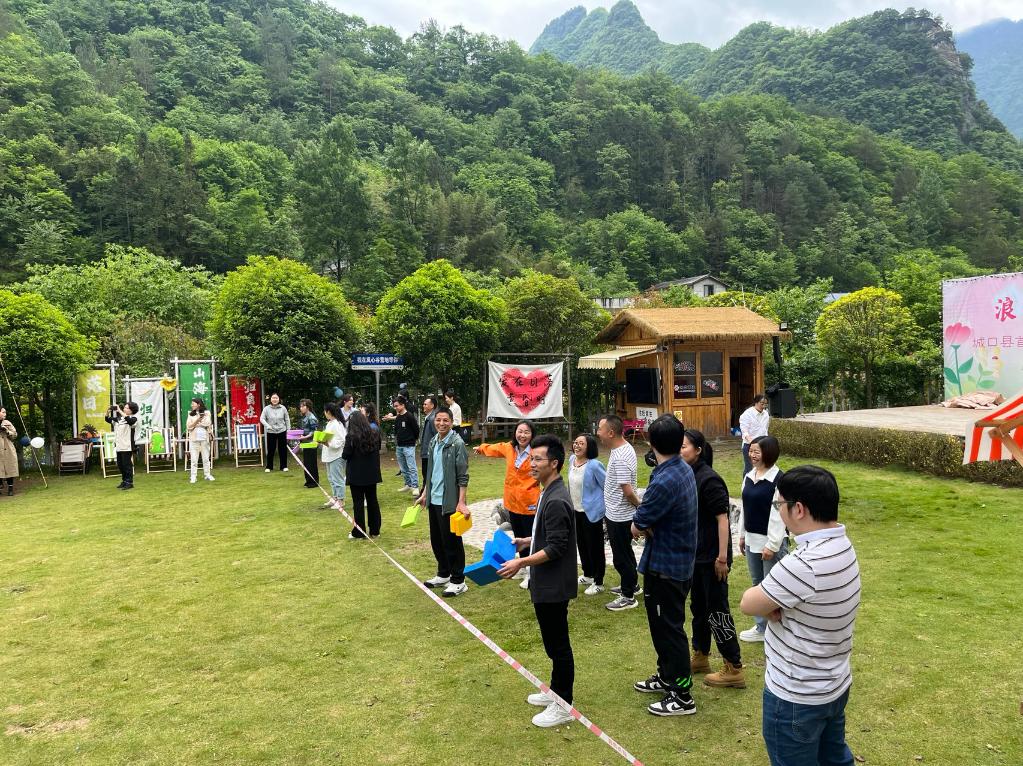 在位于重庆市城口县岚天乡的星空露营基地,群众正在开展团建活动。新华社记者周思宇 摄