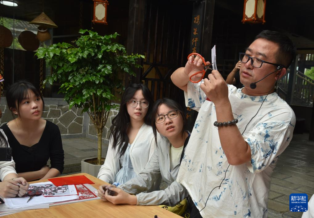 7月3日,香港师生在贵州省务川县龙潭村体验仡佬族剪纸技艺。新华社记者 骆飞 摄