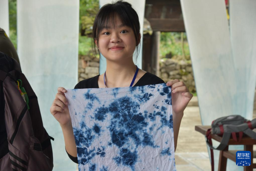 7月3日,香港学生在贵州省务川县龙潭村展示制作的扎染作品。新华社记者 骆飞 摄