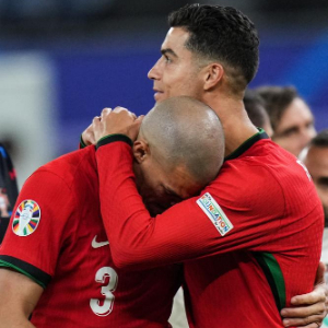 7月5日,葡萄牙队球员克·罗纳尔多(右)比赛后安慰队友佩佩。当日,在德国斯图加特进行的2024欧洲足球锦标赛四分之一决赛中,葡萄牙队和法国队在常规时间和加时赛战成0比0,最终在点球大战中,法国队5比3战胜葡萄牙队,晋级四强。新华社记者 彭子洋 摄