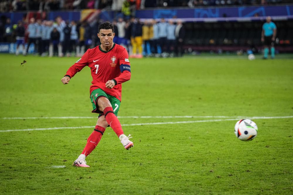 7月5日,葡萄牙队球员克·罗纳尔多在点球大战中主罚点球命中。当日,在德国斯图加特进行的2024欧洲足球锦标赛四分之一决赛中,葡萄牙队和法国队在常规时间和加时赛战成0比0,最终在点球大战中,法国队5比3战胜葡萄牙队,晋级四强。新华社记者 潘昱龙 摄
