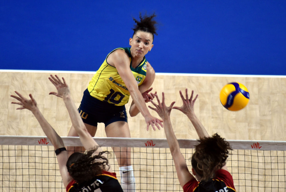 6月13日,巴西队球员加布丽埃拉·吉马良斯(上)在比赛中扣球。当日,在世界女排联赛中国香港站比赛中,巴西队3:1战胜德国队。新华社记者 卢炳辉 摄