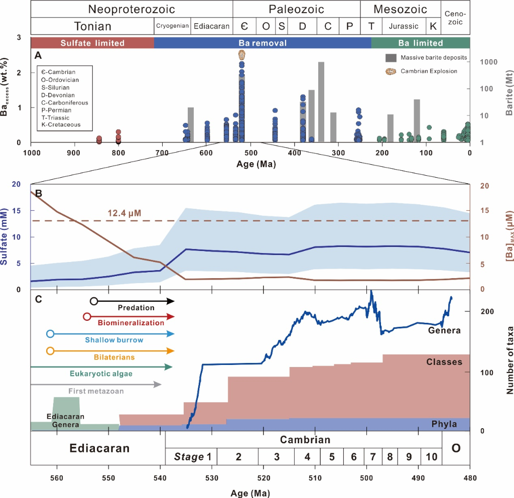 近期,卫炜等人通过扬子板块下寒武统富金属页岩的钡同位素数据发现,埃迪卡拉纪-寒武纪过渡时期海洋的逐渐氧化提升了硫酸根浓度,导致此前累积的溶解钡离子以重晶石形式被大量移除。水体中高浓度的钡会抑制水生动物的存活率,因此,对动物有毒害作用的硫化物和钡离子的移除,改善了海洋的宜居性,促使了寒武纪生命大爆发。