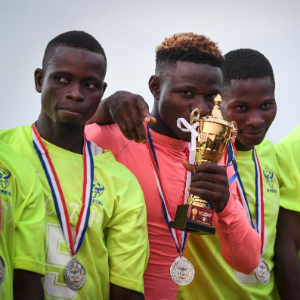 5月25日,在贝宁帕拉库市美丽城村,公园村7队守门员在颁奖仪式中亲吻奖杯。