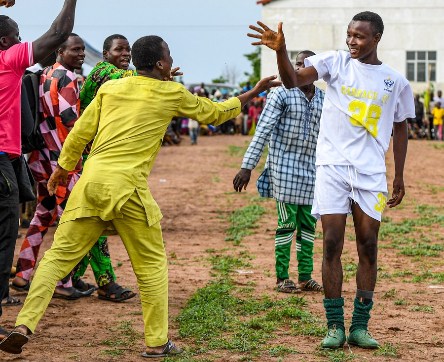 5月25日,在贝宁帕拉库市美丽城村,一名球员在“村超”决赛中进球后与球迷击掌庆祝。