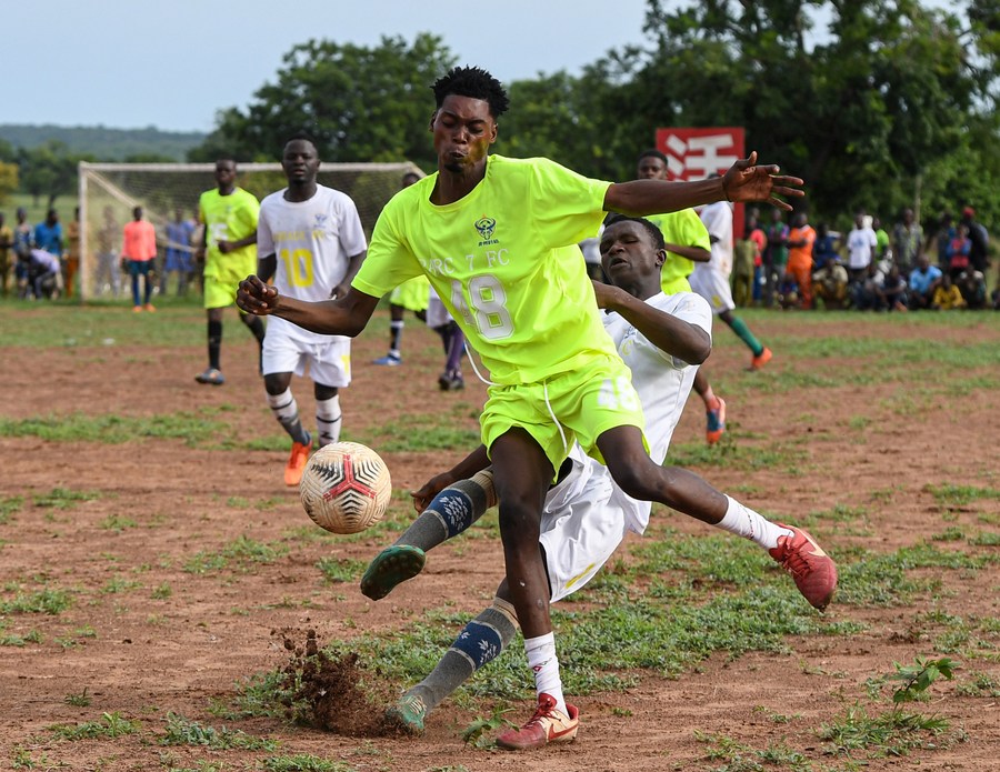 5月25日,在贝宁帕拉库市美丽城村,球员在“村超”决赛中拼抢。