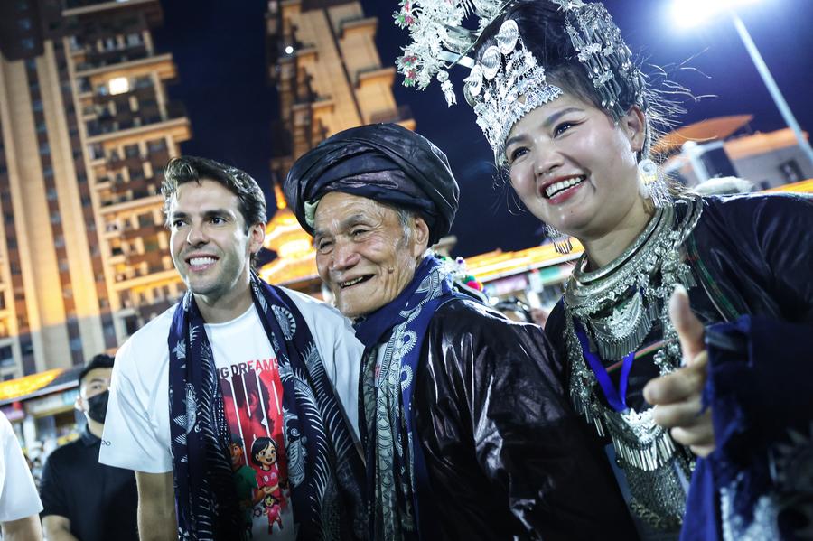 5月27日,“逐梦”冠军公益赛在榕江“村超”球场举行,世界足球先生卡卡、前国脚郜林、前中国女足队员王坤等明星球员与榕江当地的“村超”球员和青少年女足队员交流球技。偌大的“村超”球场挤进了数万名球迷,热情几乎让全场的空气都滚烫起来,欢呼声、加油声在月亮山间久久回荡。赛场边“贵州村超”四个大字更是熠熠生辉,足球让这座山中小县城吸引了世界的目光。