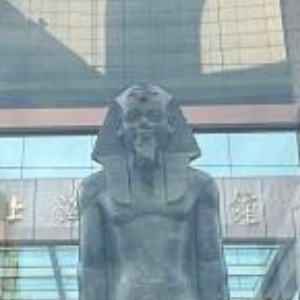 7月17日在上海博物馆人民广场馆南门拍摄的美内普塔站像,高2.4米、重2吨多。这是上海博物馆首次把文物展品放在室外展出。新华社记者刘颖 摄