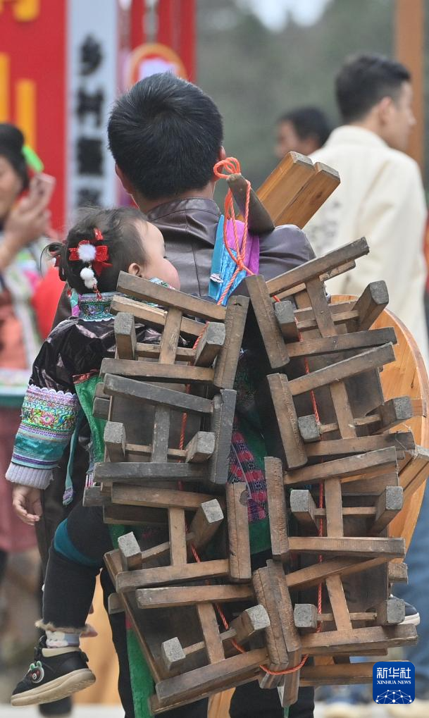 乌英屯的村民背着孩子、挑着板凳去参加百家宴(2024年2月14日摄)。