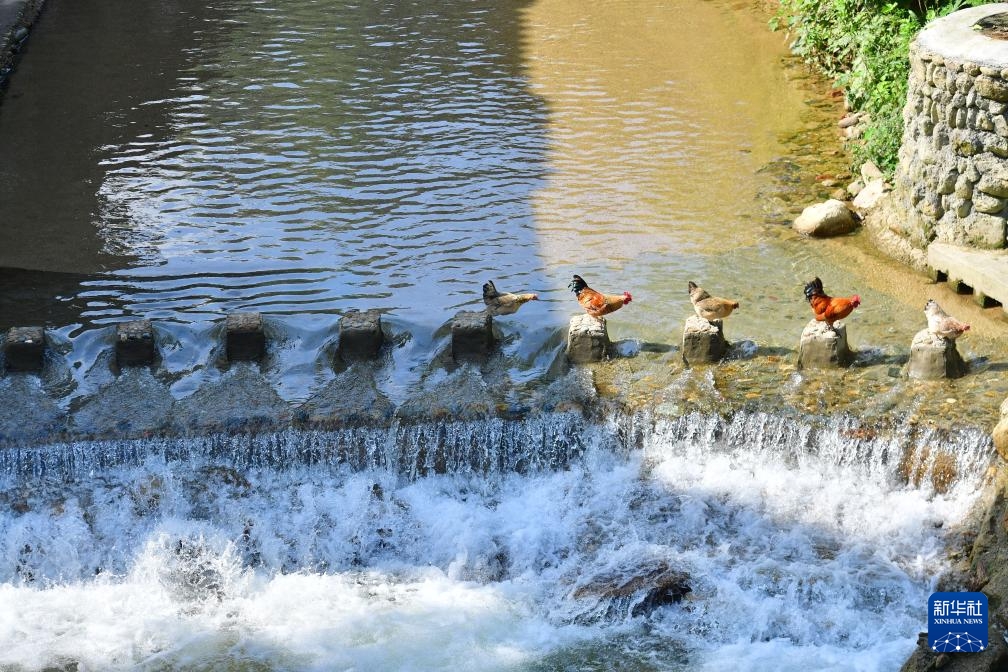 乌英屯内几只鸡在过河(2021年8月21日摄)。