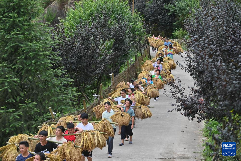 乌英屯村民挑着禾把去参加满月酒宴(2024年7月13日摄)。